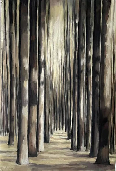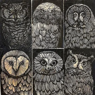 Andrea Tishman says she has never been good at taking advice. She creates in a variety of mediums, including oil paint, pastel and charcoal, and printmaking. Recently, she has begun branching out into using repurposed materials, specifically used tea bags. Her Teabag Series features portraits of birds and insects whose populations are in decline. The images of these creatures convey a liveliness, with many of the birds depicted with their beaks open in calls. The delicate lines around the insects bring a motion that makes it clear they are not just pinned to a board. Andea finds much of her inspiration in the natural world and explains that she is “particularly interested in the friction, overlap, and fragile balance between human and non-human worlds. When [passing} by a gnarly tree planted long ago, or watching the choreography of flocks of birds, [she is] inspired to express [her] observations visually.” Andrea has been a member of Waltham Open Studios since 2010 and is the artist who is currently responsible for making Waltham Open Studios happen every year!
